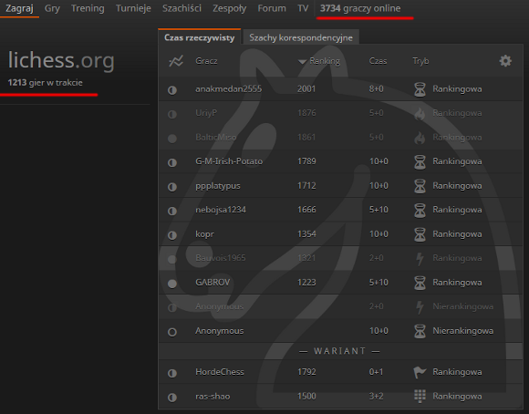 Serwer Lichess.org regularnie już przekracza próg 3 700 użytkowników i 1200 partii granych równocześnie. Gratulacje !